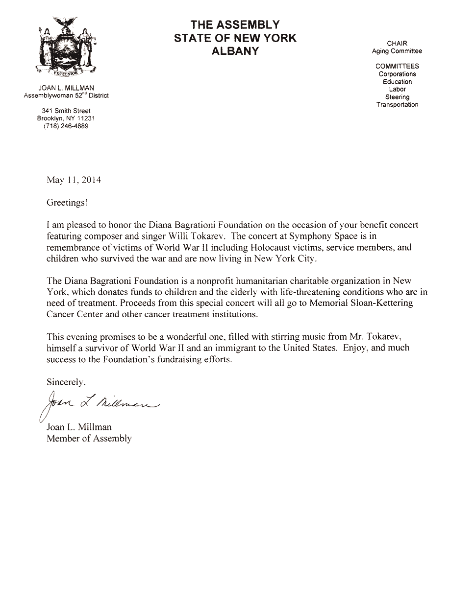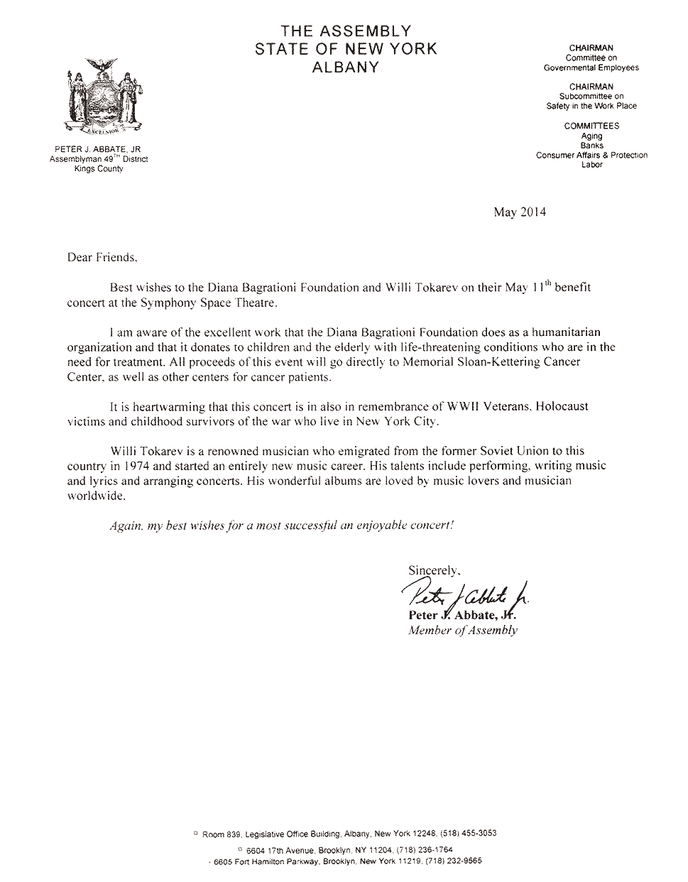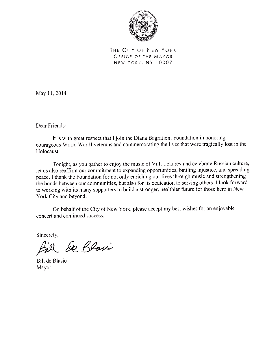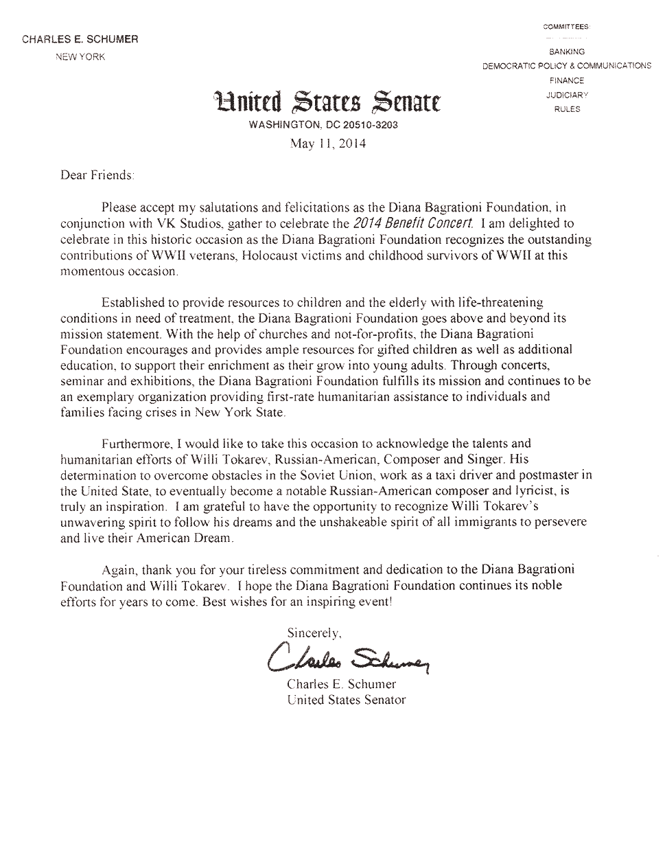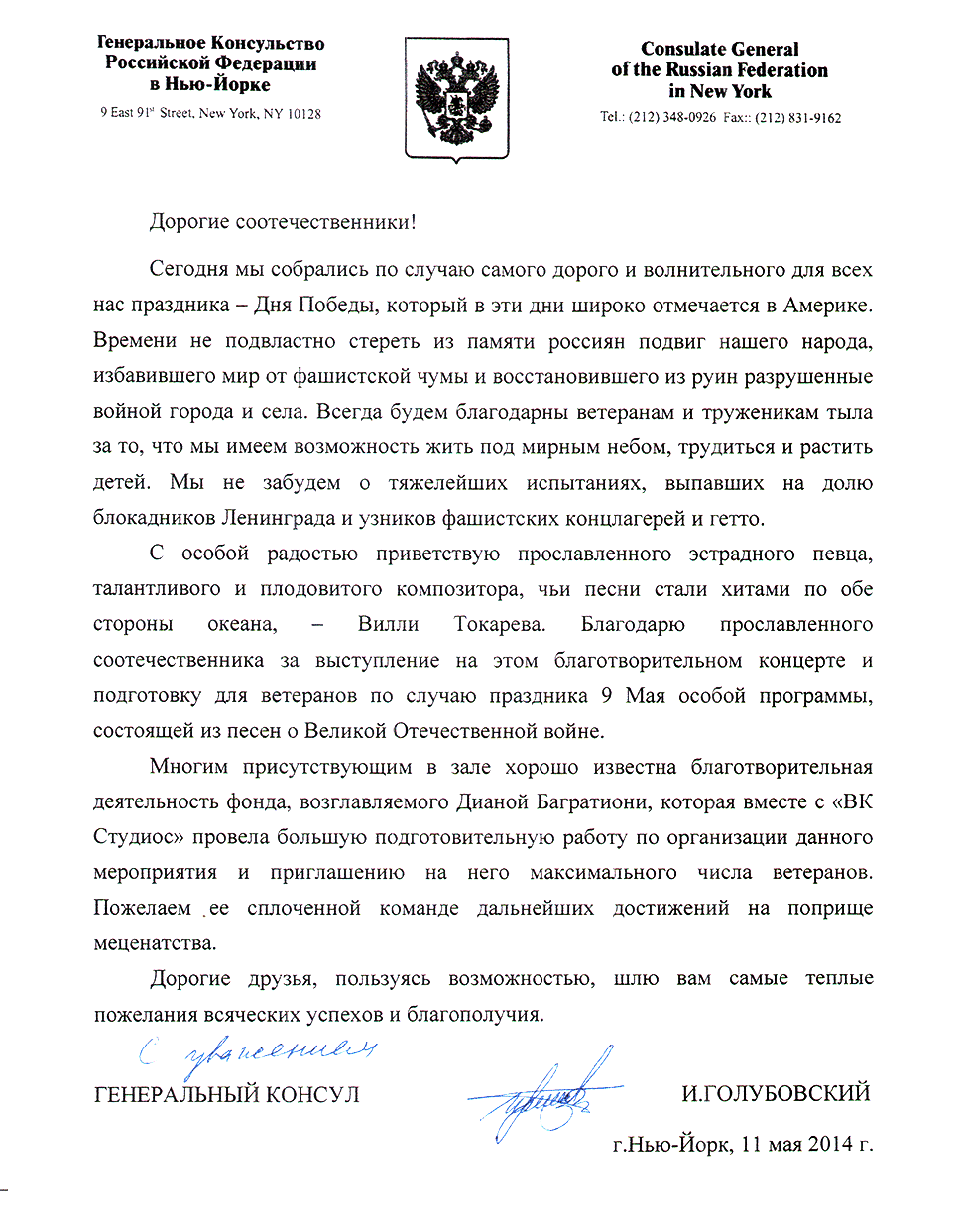 Письма и почётные знаки по случаю концерта в Symphony Space 20 мая 2014 Благодарственные письма и почётные знаки по случаю благотворительного концерта в Symphony Space, на Бродвее, посвящённому Дню Победы 9 мая.