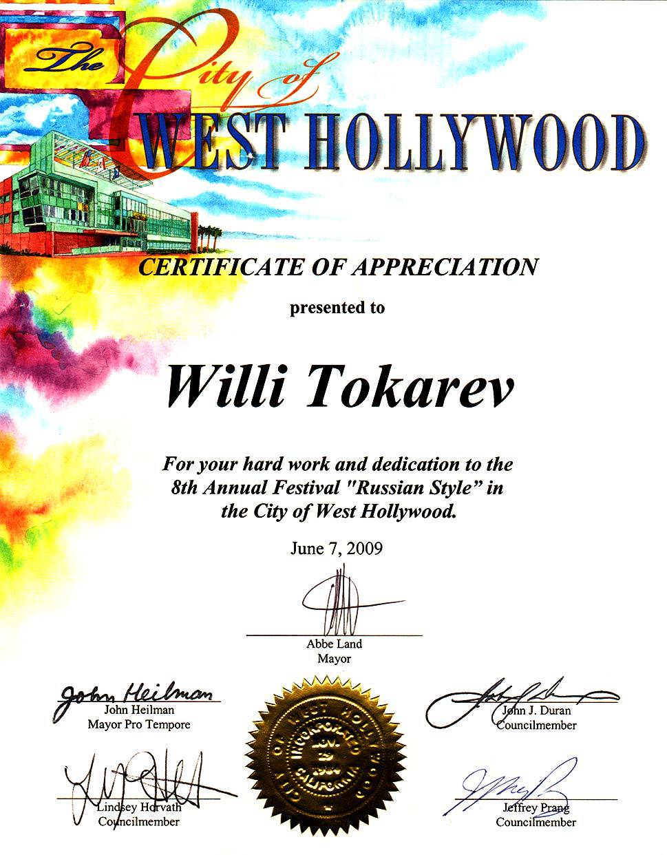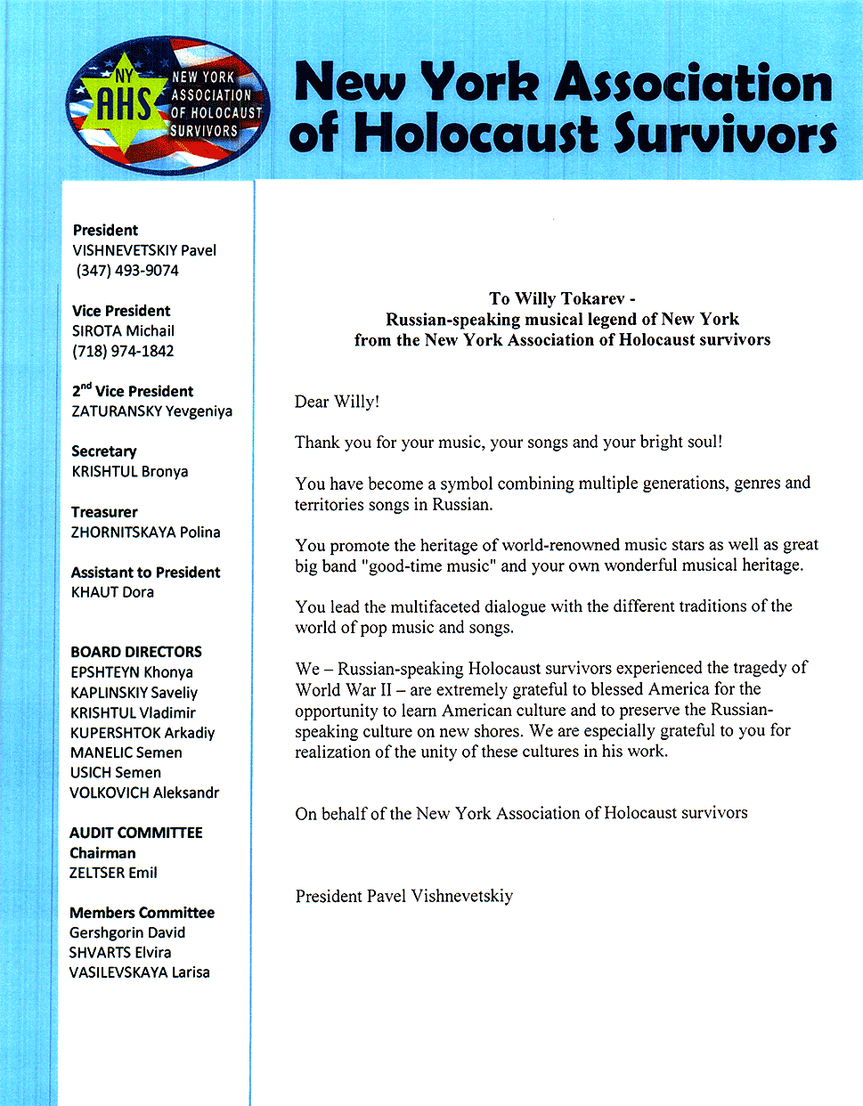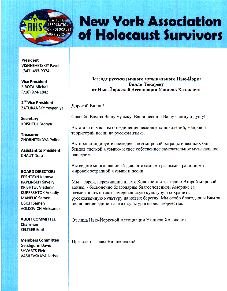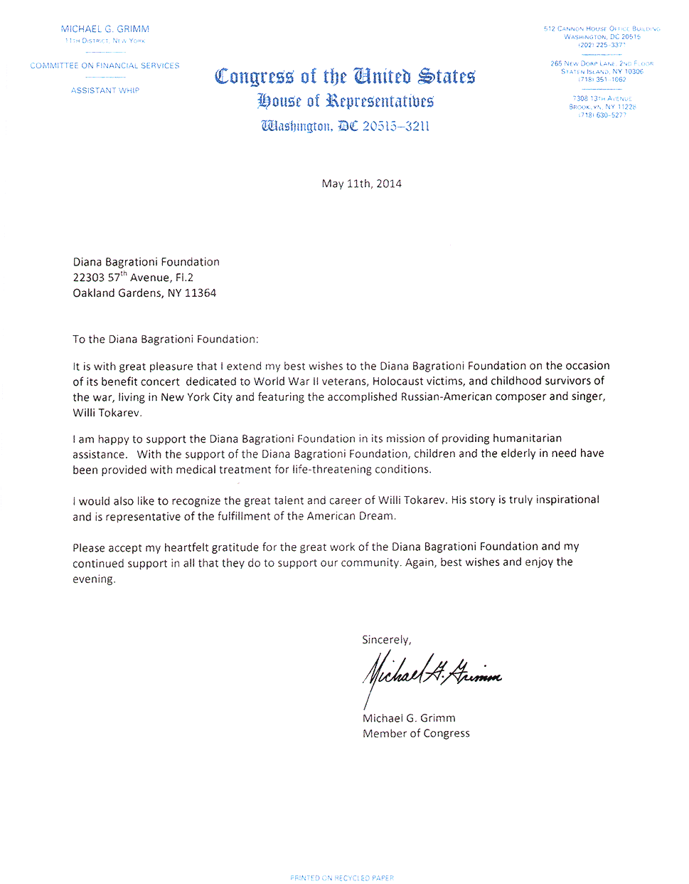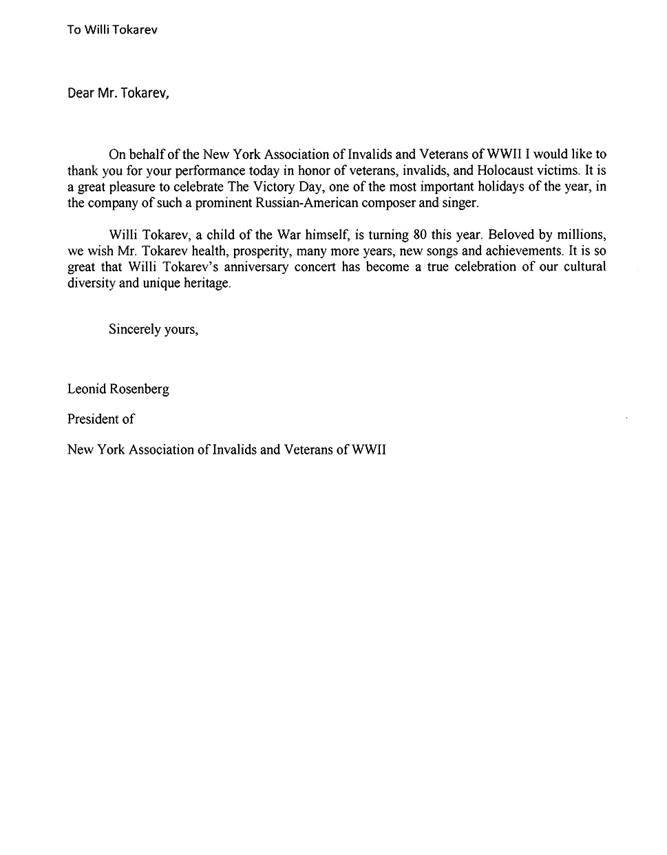 Письма и почётные знаки по случаю концерта в Symphony Space 20 мая 2014 Благодарственные письма и почётные знаки по случаю благотворительного концерта в Symphony Space, на Бродвее, посвящённому Дню Победы 9 мая.